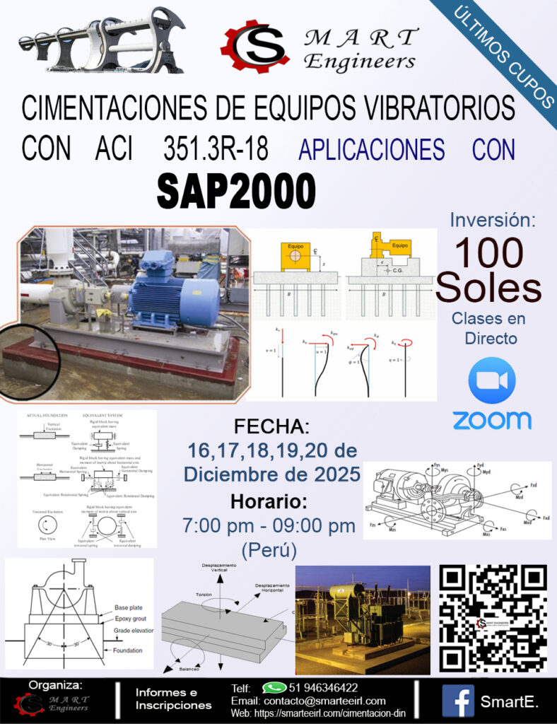 Bienvenido al curso completo de DISEÑO DE CIMENTACIONES DE EQUIPOS VIBRATORIOS, APLICACIONES CON EL PROGRAMA SAP2000, que se llevará a cabo desde el Miércoles 17 de Diciembre, hasta el lunes 22 de Diciembre. Las clases son en vivo mediante la plataforma de zoom, además luego te brindaremos todas las clases grabadas, para que las puedas repasar. (las clases en vivo todos los días de martes a sábado de 7:00 pm a 09:00 pm)