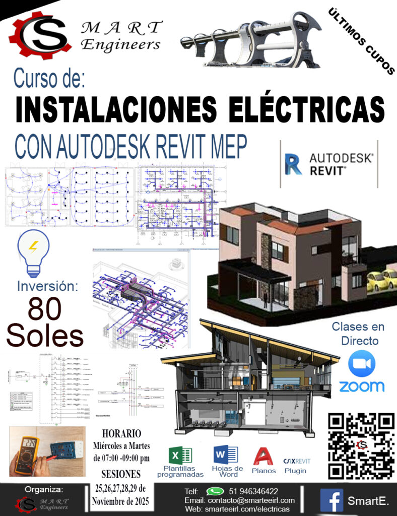 bienvenido al curso completo de INSTALACIONES ELÉCTRICAS, Aplicaciones con el programa Autodesk Revit MEP, que se llevará a cabo desde el martes 25 de Noviembre, hasta el Viernes 29 de Noviembre de 2025. Las clases son en vivo mediante la plataforma de zoom, además luego te brindaremos todas las clases grabadas, para que las puedas repasar. (las clases en vivo todos los días de martes de 07:00 a 09:00 pm, martes de sábados 7:00 pm a 9:00 pm (25,26,27,28,29 de Noviembre de 2025)